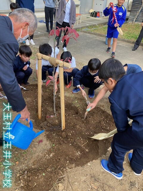 2023年11月2日 15時35分学校創立150周年記念事業の一つである「記念植樹」が本日実施されました。PTA環境整備委員会が中心となり準備を進め、麻生PTA環境整備委員長の司会のもと、各学年代表児童が記念植樹に臨みました。植樹した木は「ハナミズキ」です。花言葉は「永続性、耐久性、返礼」です。