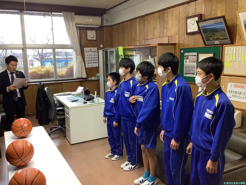 2023年12月15日 12時31分ふくしまファイヤーボンズの西田社長、赤司様、村内の企業である(株)イイジマ東北の永井様、日向様が来校され、「子どもたちに!」とバスケットボールを寄贈下さいました。代表児童5名が寄贈のボールを受け取りました。