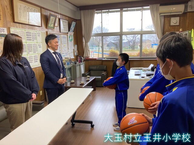 ふくしまファイヤーボンズの西田社長、赤司様、村内の企業である(株)イイジマ東北の永井様、日向様が来校され、「子どもたちに!」とバスケットボールを寄贈下さいました。代表児童5名が寄贈のボールを受け取りました。