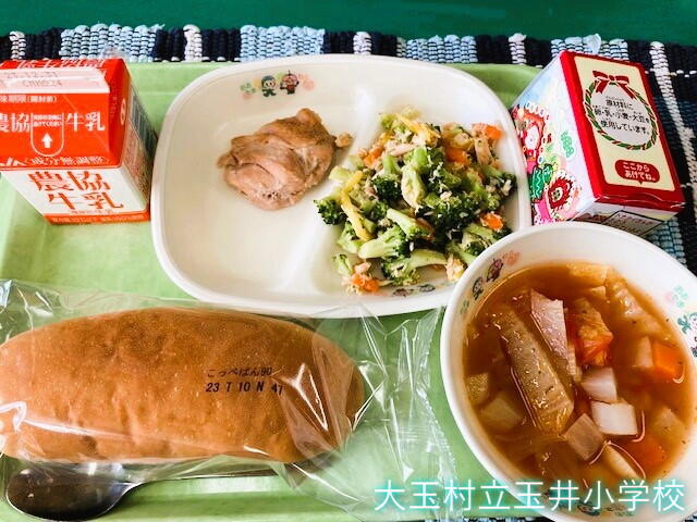 2023年12月20日 12時14分今日は少し早めのクリスマス献立です。主菜は給食センターのオーブンでじっくり焼いた「照り焼きチキン」、副菜は、ツリーに見立てた「ブロッコリーサラダ」、汁物は冬野菜がたっぷり入った「冬のミネストローネ」です。デザートは、クリスマスケーキの「メゾン・ド・ノエル」です。「メゾン・ド・ノエル」はフランス語でクリスマス・ハウスを意味します。かわいい屋根の形をしたケーキです。