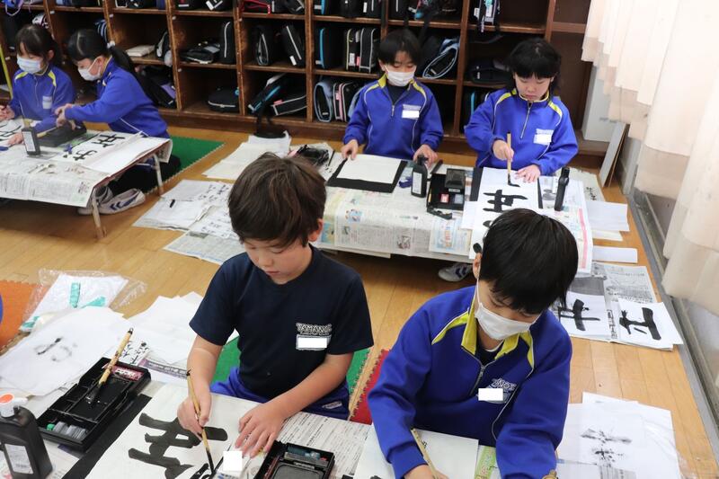 繁子先生による書写指導です。「お年玉」3文字ですが長い半紙にバランスよく書くのは難しいね。小筆で名前も上手に書けたかな?