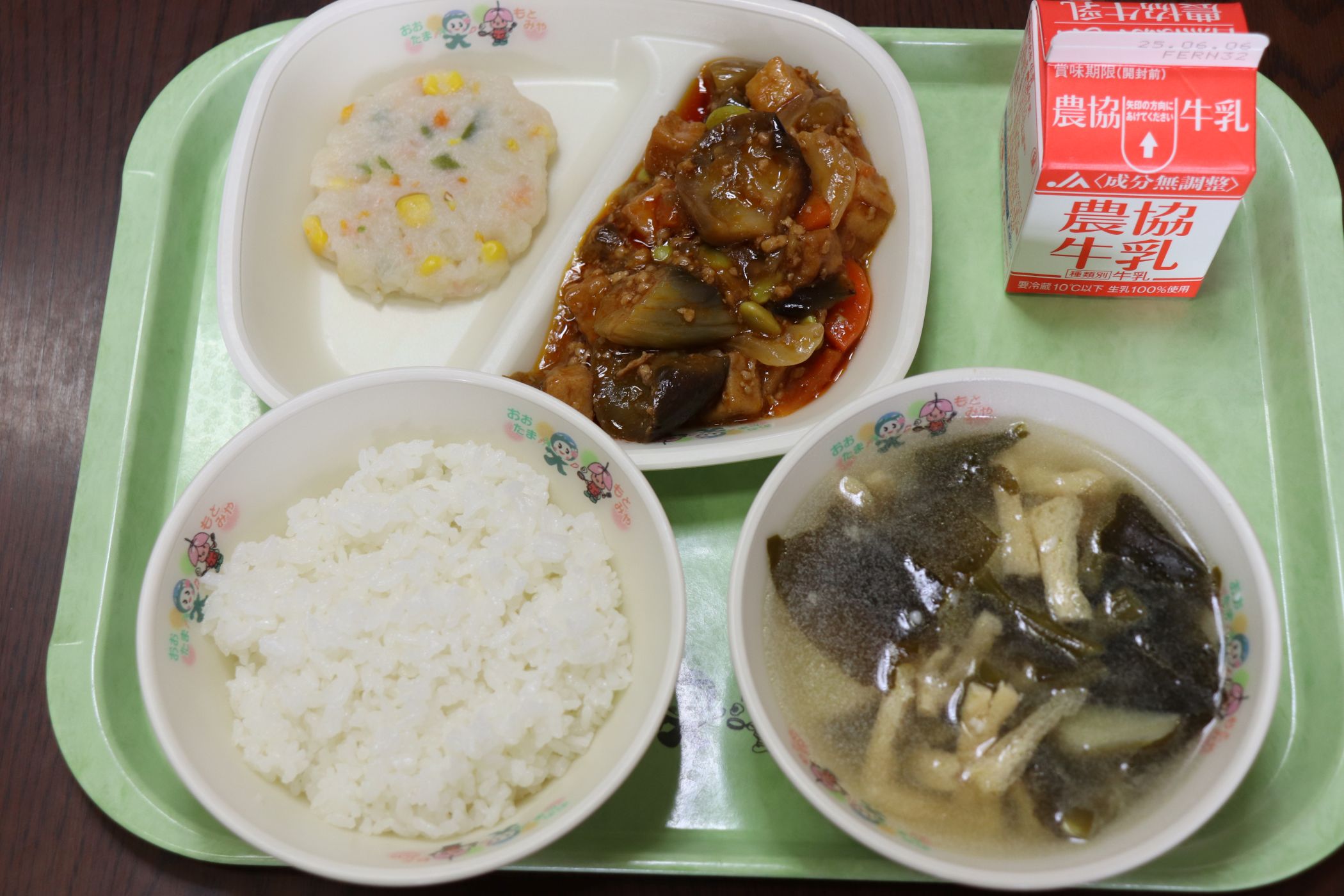 2025年5月26日 12時00分今日の給食🍴のメニューは、ご飯・厚揚げ入り酢豚・野菜のふっくら寄せ・じゃがいものみそ汁・牛乳です。(637㎉) 野菜のふっくら寄席は、野菜が入ったかまぼこのような味でした。もっちり食感ですが、味はあっさりしておいしかったです。ごちそうさまでした。