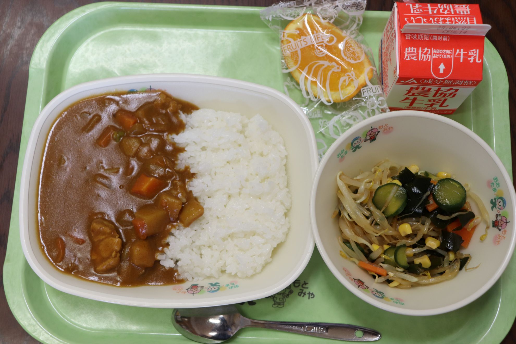 2025年5月29日 12時05分今日の給食🍴のメニューは、チキンカレー🍛・もやしとわかめのサラダ🥗・オレンジ🍊・牛乳🥛です。(604㎉) 今日は王道の「チキンカレー」でした。「もう一杯!」と言いたくなるような味わいでした。ごちそうさまでした。