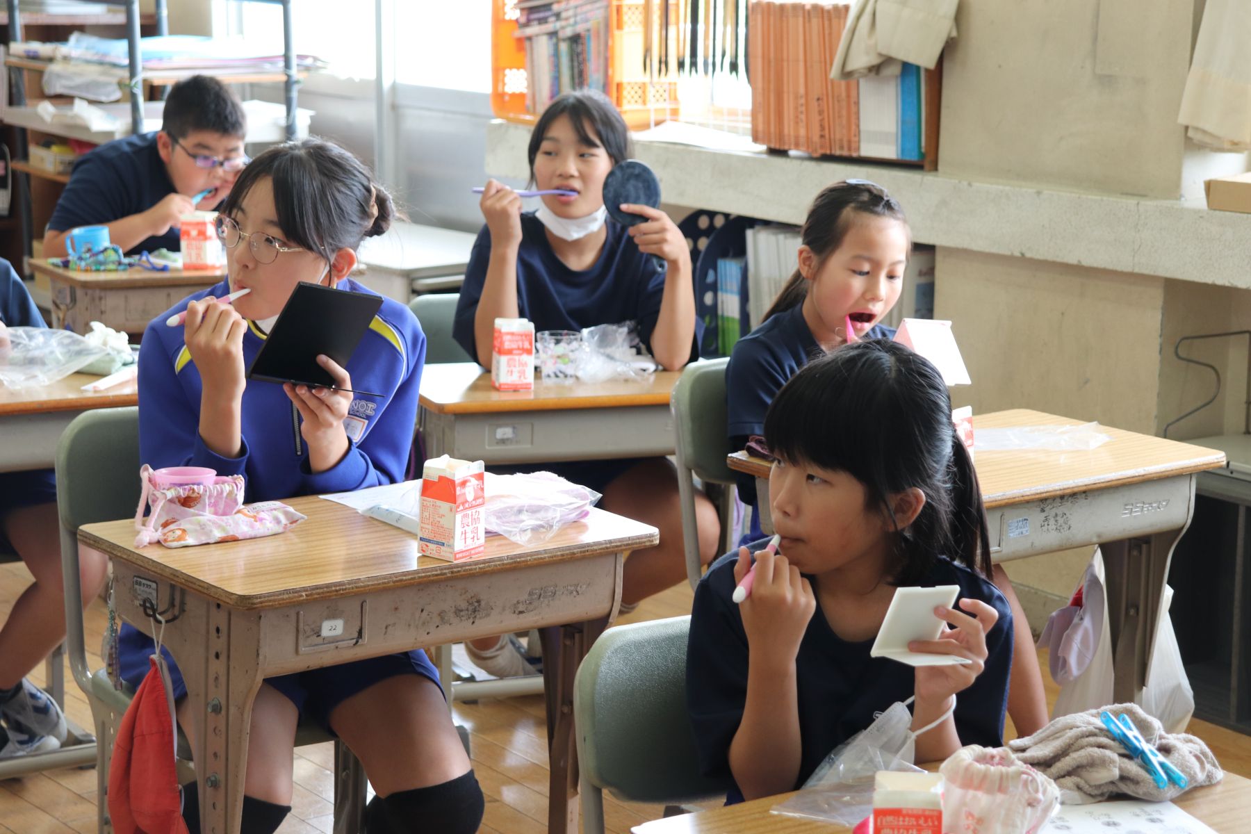 2025年6月26日 12時20分昨日の中学年に続いて、今日は高学年は「歯の健康教室」を実施しました。永久歯は一度失ったらもう生えてきません(≧◇≦)。ビスケットの試食や染め出しの後は、鏡を見ながら大切な歯を一本一本丁寧に磨きました。